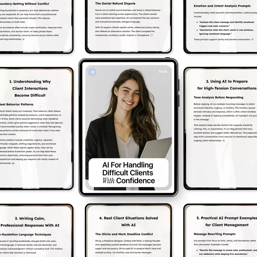Unlike generic communication guides, this ebook focuses specifically on ai for dealing with difficult clients in real-world business situations. You are not just learning theory. You are getting practical prompts, realistic examples, and clear guidance on how to combine AI support with your own professional judgment. The result is communication that feels human, respectful, and confident, not robotic.