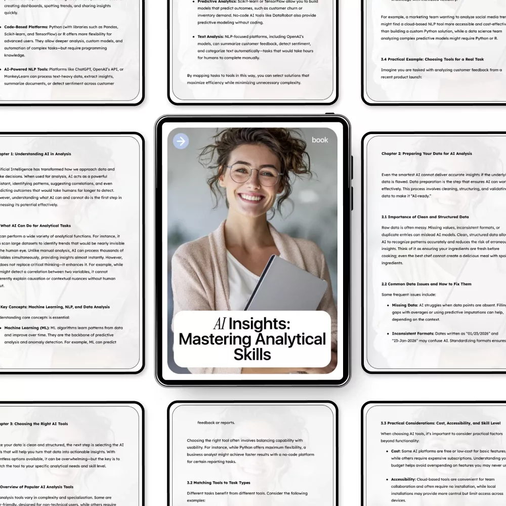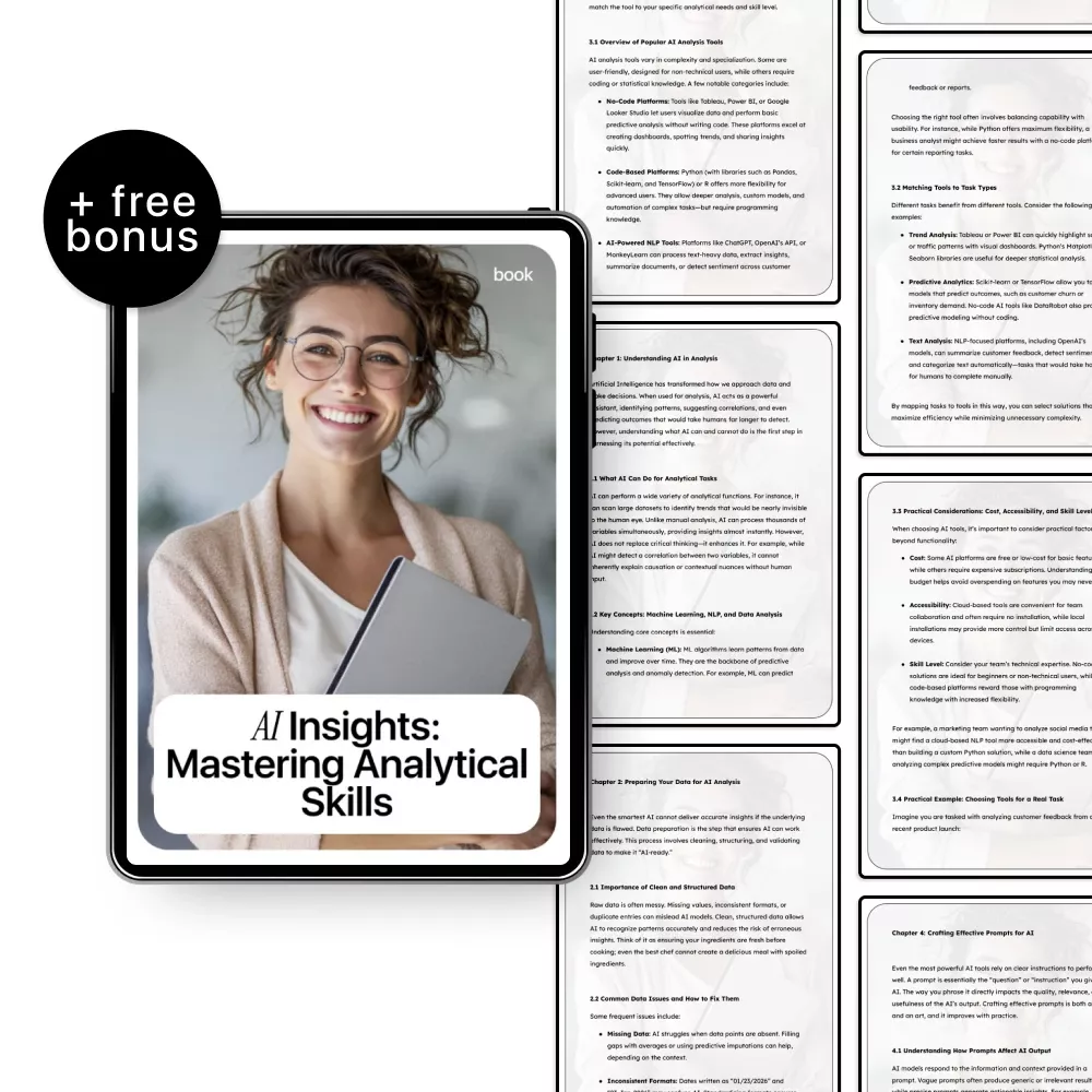 Unlike generic AI guides, AI Insights: Mastering Analytical Skills focuses on thinking clearly with AI, not blindly trusting it. You’ll learn how to question outputs, refine prompts, and apply context—skills that separate effective analysts from casual tool users. The included practical examples make the lessons immediately usable.