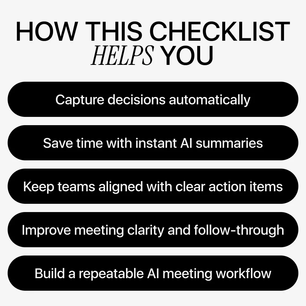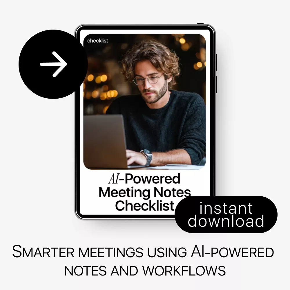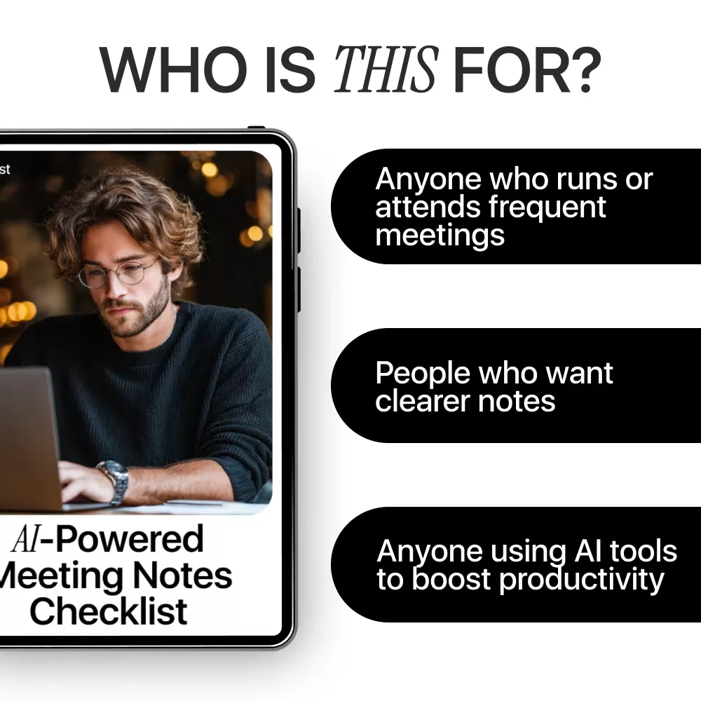 This checklist is ideal for entrepreneurs, remote teams, managers, freelancers, coaches, and anyone who runs frequent meetings and wants better results. If you use AI meeting notes tools—or want to start—this resource gives you a proven system without the learning curve.
