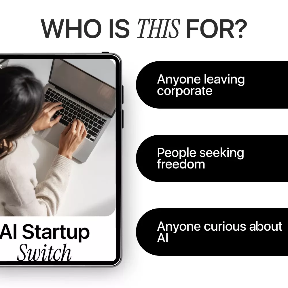 Unlike generic guides, AI Startup Switch combines practical step-by-step actions with AI-powered strategies, giving you a concrete roadmap and an unfair advantage over your past corporate self. It’s actionable, fast-paced, and focused on real results—not just theory.