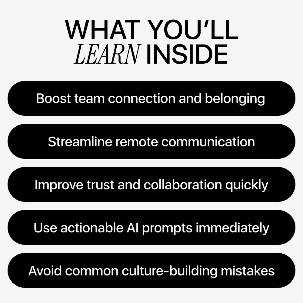• Foundations of Team Culture in Remote Work: Understand what team culture means without an office, why culture breaks down in distributed teams, and where AI fits into human-centered collaboration.