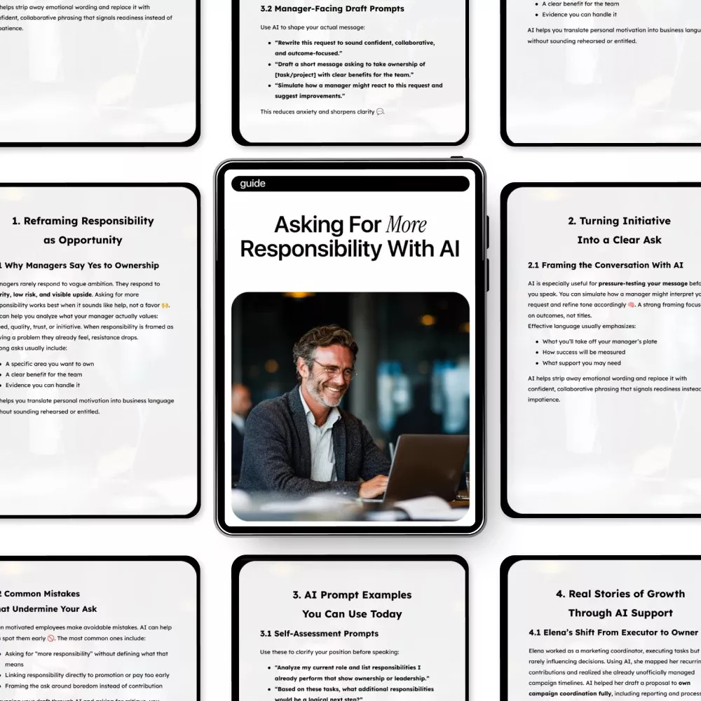Take control of your growth and communicate your value with clarity and confidence. Download Asking for More Responsibility With AI today and start shaping the next phase of your career—one strategic conversation at a time.
