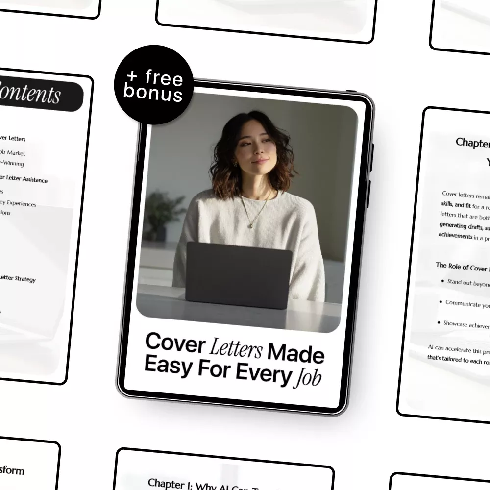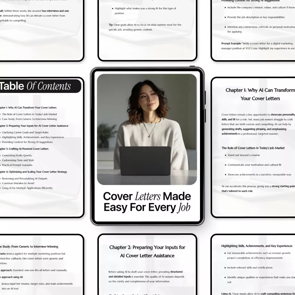 - Chapter 3: Crafting AI-Powered Cover Letters – Generate drafts quickly, customize tone and style, and explore practical prompt examples to guide AI.