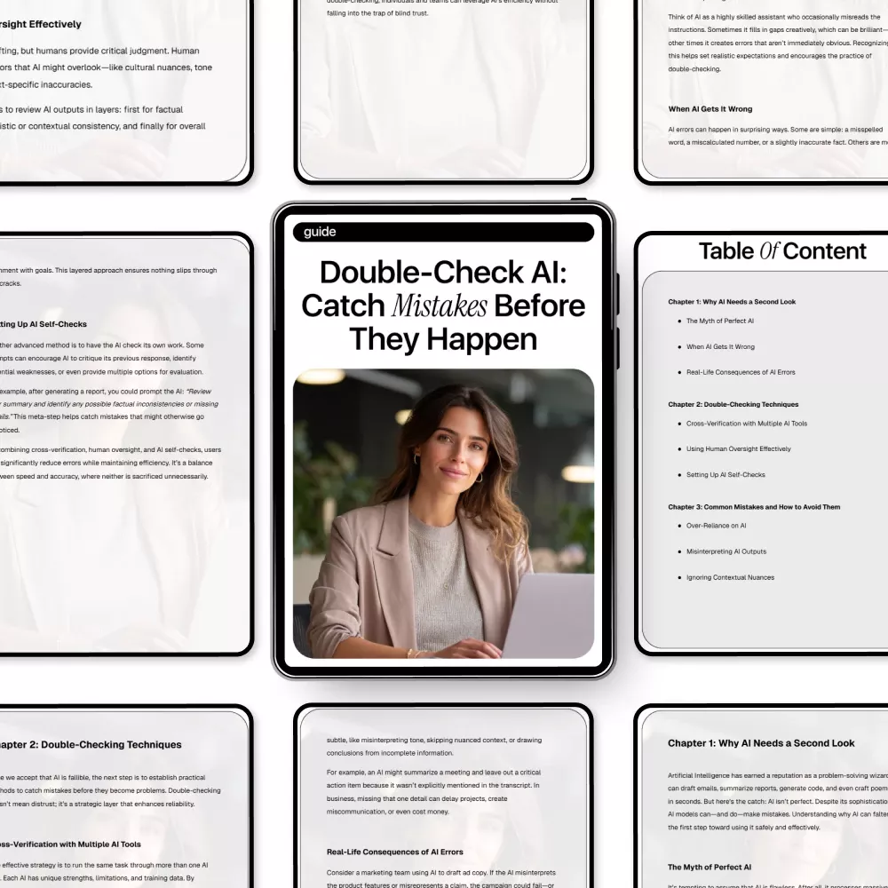 Unlike generic AI guides, this resource focuses specifically on prevention. Instead of teaching you what AI can do, it teaches you how to verify, validate, and protect yourself. With real-world examples, clear workflows, and ready-to-use prompts, you’ll learn how to work smarter—not riskier.