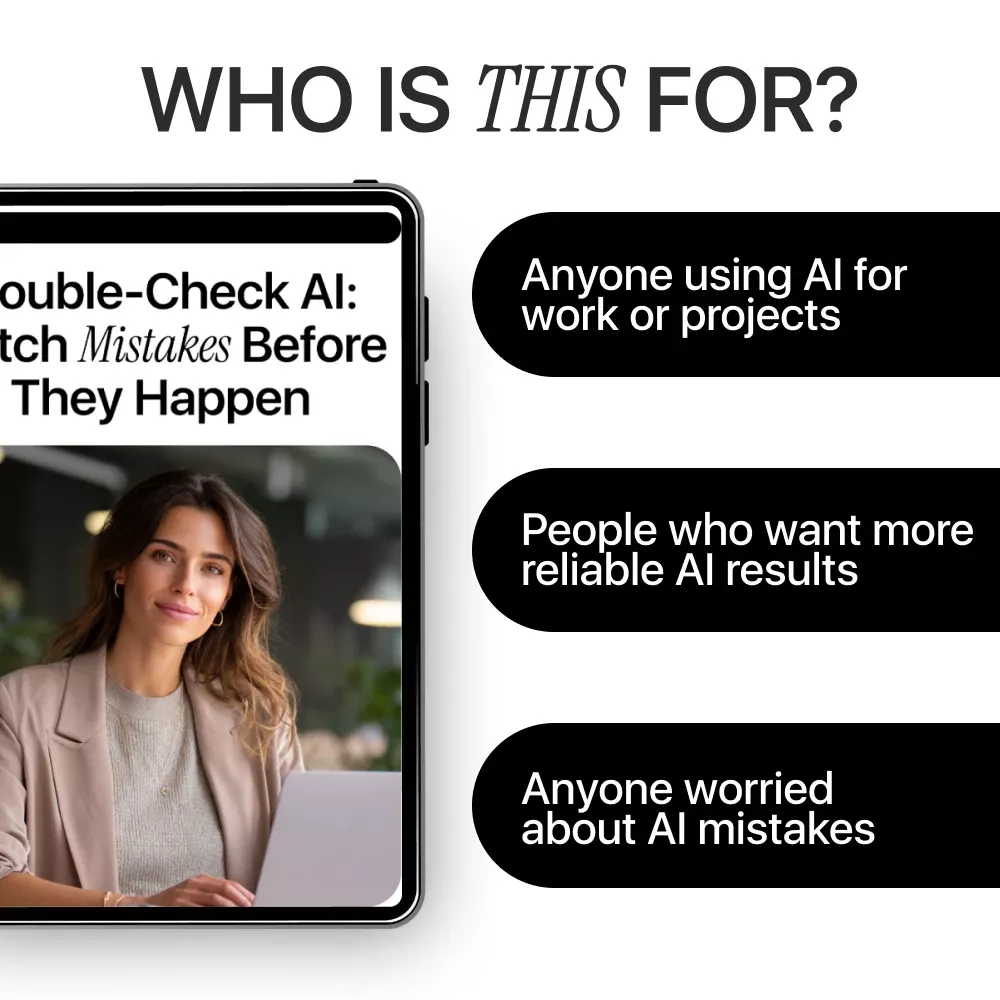 AI can save time, boost productivity, and unlock powerful insights—but it can also make costly mistakes. Double-Check AI: Catch Mistakes Before They Happen is a practical, easy-to-follow digital guide designed to help you spot errors, reduce risks, and confidently use AI without blind trust. Whether you rely on AI for work, business, or content creation, this resource shows you exactly how to add a safety net before small issues turn into big problems.
