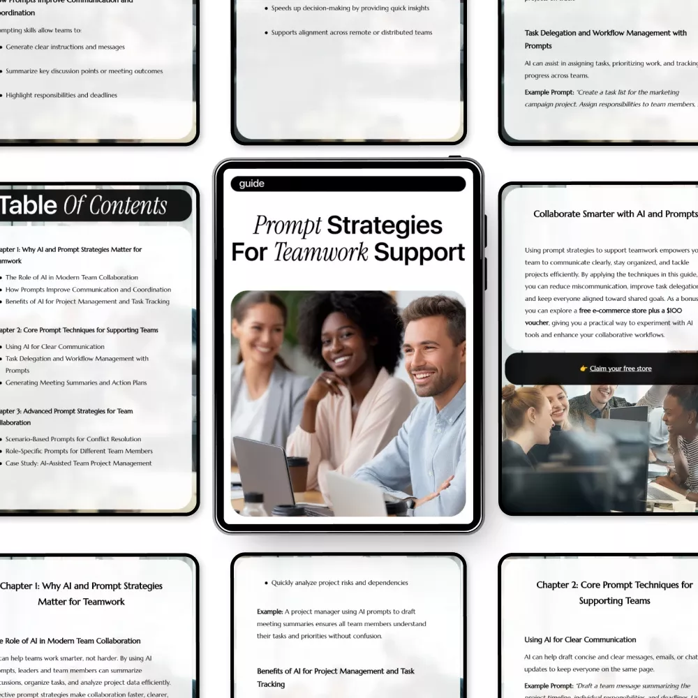Unlike other resources, this guide focuses specifically on actionable prompt strategies for teamwork support, integrating AI tools to improve real-world team collaboration. With both core techniques and advanced strategies, you’ll gain a complete toolkit to streamline workflows, resolve conflicts, and build a library of effective prompts that evolve with your team’s needs.