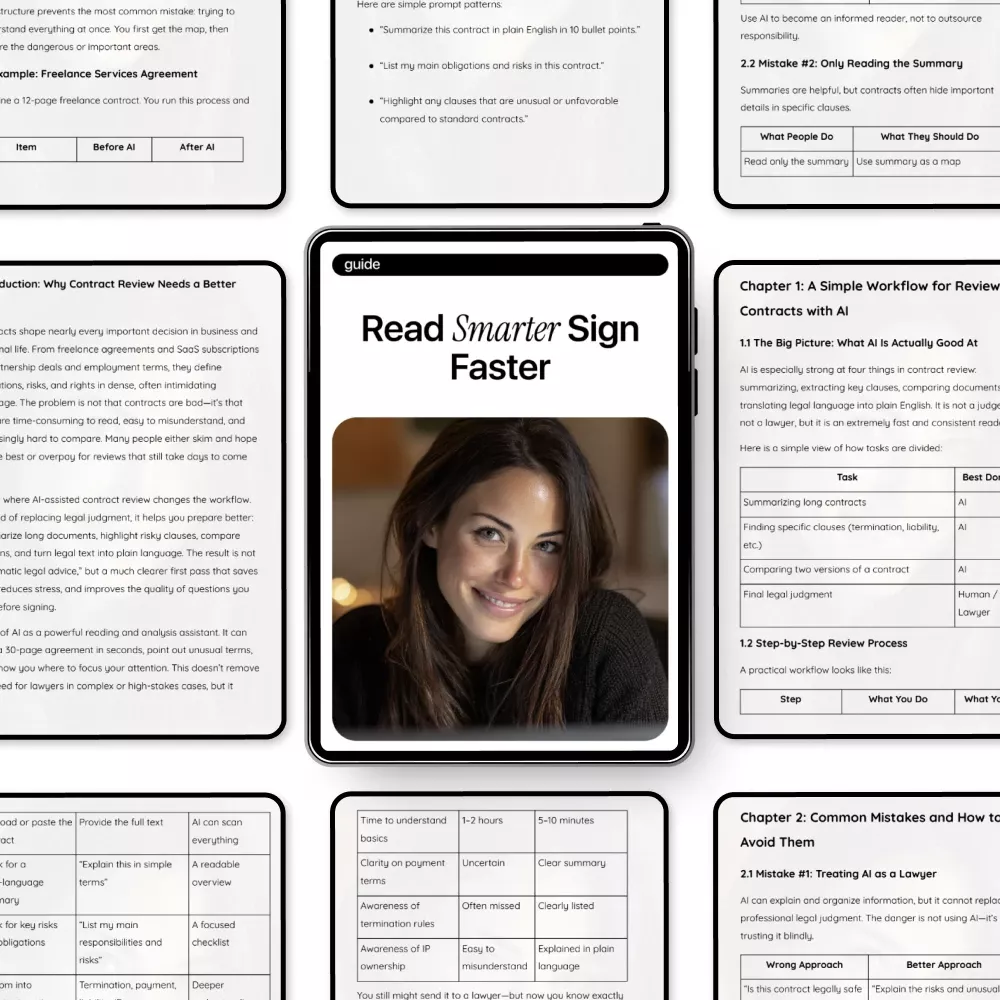 Contracts shouldn’t feel overwhelming, intimidating, or impossible to understand. Read Smarter Sign Faster is a practical, easy-to-follow guide designed to show you how to approach contract review with ai in a smart, safe, and effective way. Instead of guessing what matters or relying on vague summaries, this guide helps you build a clear workflow so you can understand agreements faster, spot risks sooner, and make better decisions before you sign.
