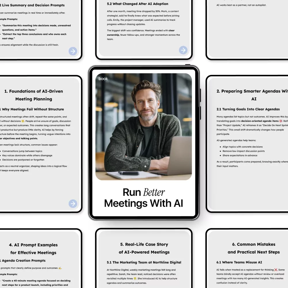 This eBook is ideal for managers, founders, remote teams, consultants, and professionals who want meetings to feel productive instead of draining. No advanced AI knowledge required.