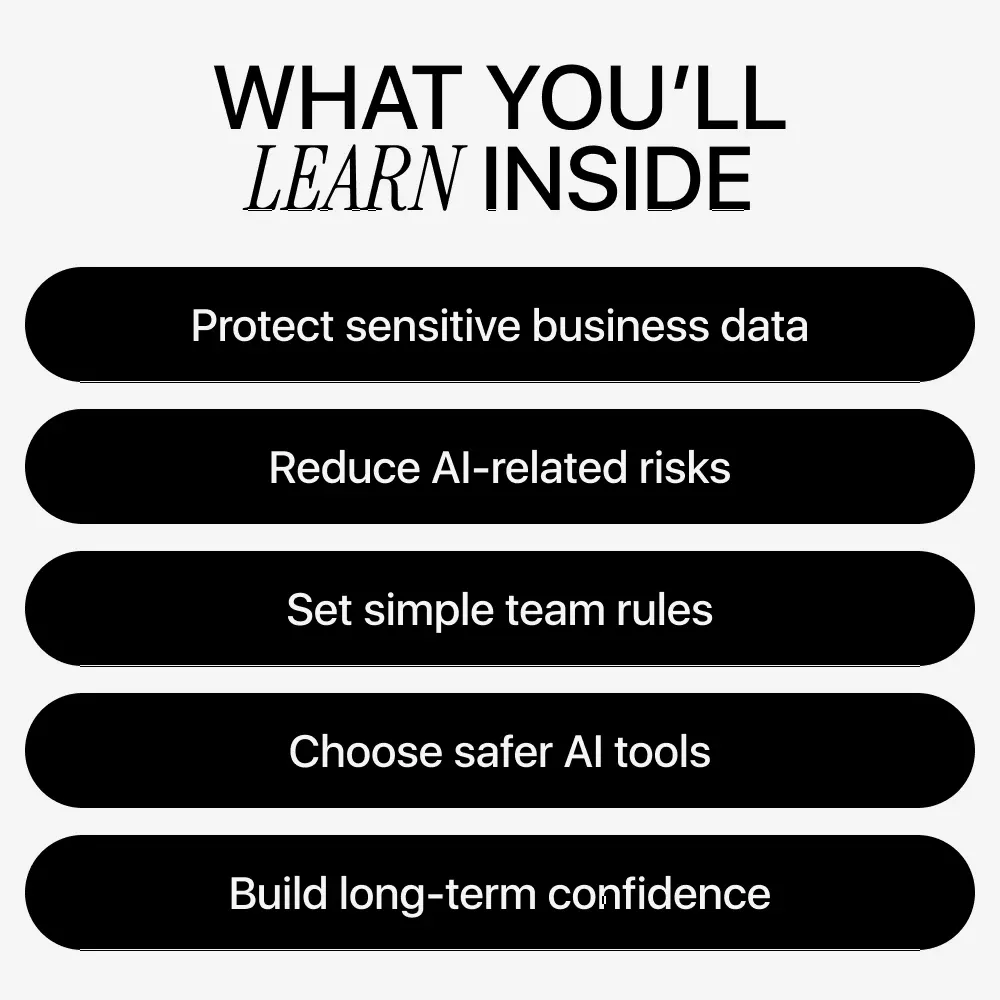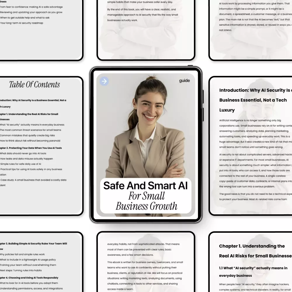 Unlike generic AI safety content, this guide is built specifically for small businesses. It focuses on realistic risks, simple habits, and practical actions—not complex policies or fear-based warnings. Every chapter is designed to be actionable, easy to understand, and immediately useful.