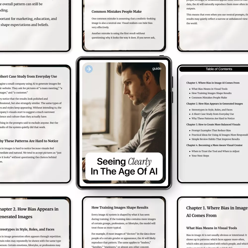 In a world flooded with AI-generated visuals, it’s easy to assume the images we see are neutral, accurate, and objective. Seeing Clearly in the Age of AI is a practical, eye-opening digital guide that helps you slow down, look closer, and understand how bias quietly shapes AI-generated images—and what you can do about it. Written in clear, human language, this guide turns a complex topic into something you can actually use in your creative work, marketing, or everyday content creation.