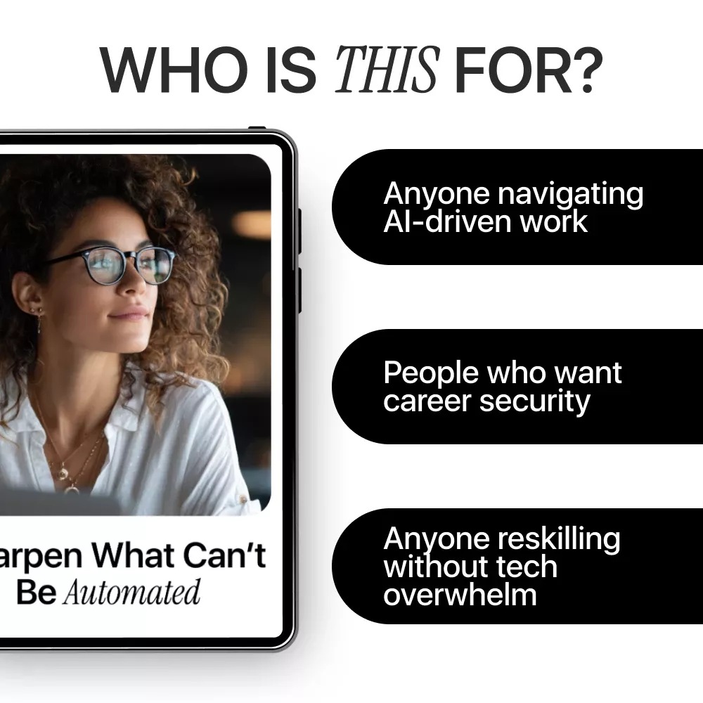 This ebook is for employees, managers, freelancers, career switchers, and lifelong learners who want practical guidance—not vague predictions. Unlike generic future-of-work content, Sharpen What Can’t Be Automated combines strategy, real examples, and hands-on prompts you can apply immediately. It focuses on human strengths AI can’t replicate, while still showing how technology can enhance your growth.