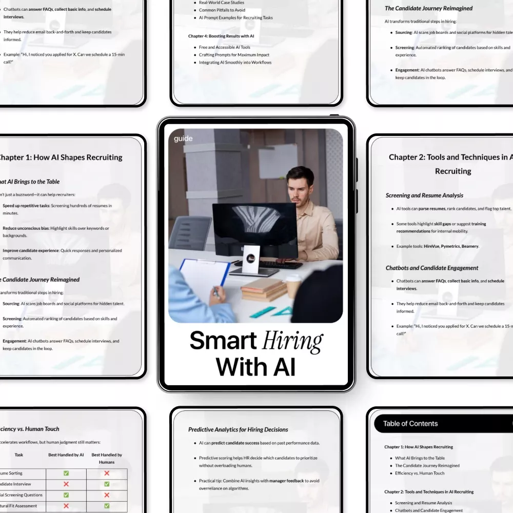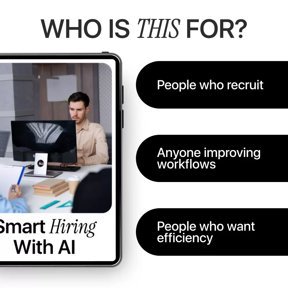 This isn’t just theory—it’s a practical, recruiter-friendly guide built for real-world hiring challenges. Instead of overwhelming tech speak, you get clear explanations, actionable tips, and workflows you can copy and adapt. It’s designed to help you make AI a natural part of your hiring process, not an extra burden.