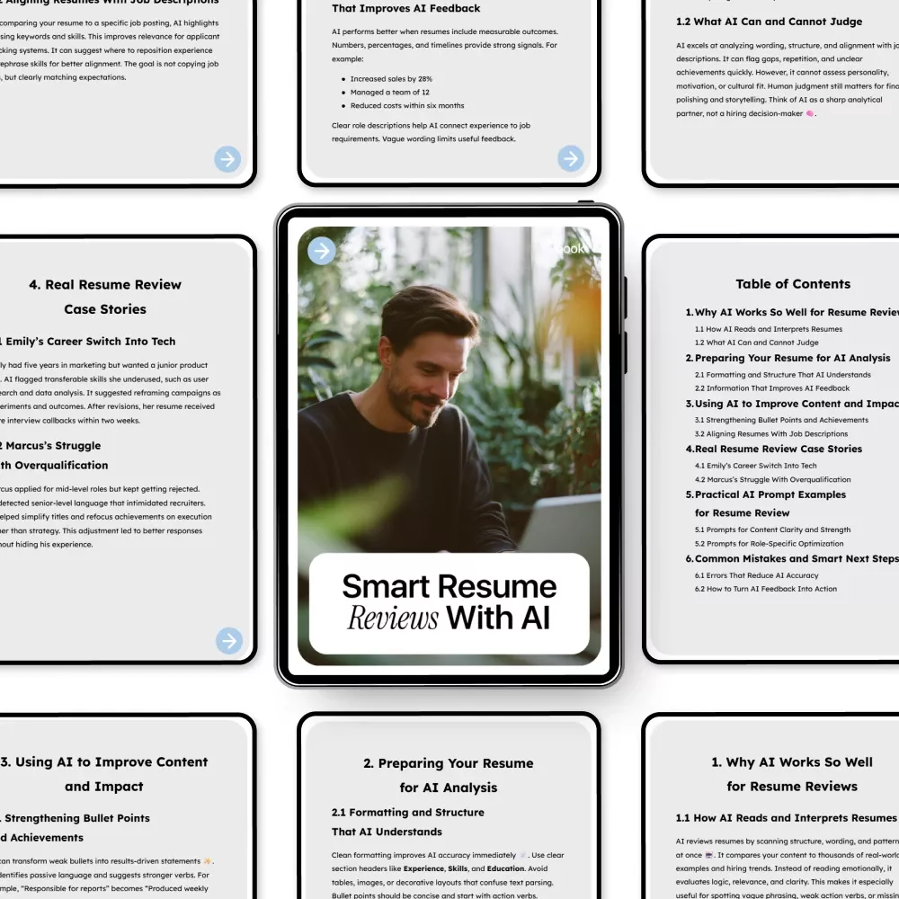Don’t leave your resume to chance. Download Smart Resume Reviews With AI now and start creating resumes that get noticed, impress hiring managers, and pass AI screening with confidence. Transform your career opportunities one optimized resume at a time.