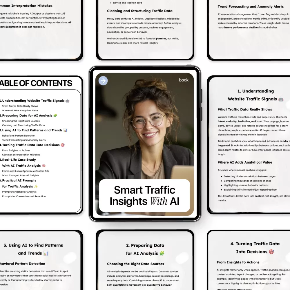 Unlike generic analytics guides, Smart Traffic Insights With AI focuses on real-world application. It combines clear explanations, a relatable case study, and practical AI prompts you can use instantly. No fluff, no theory overload—just usable insights that help you act with confidence.