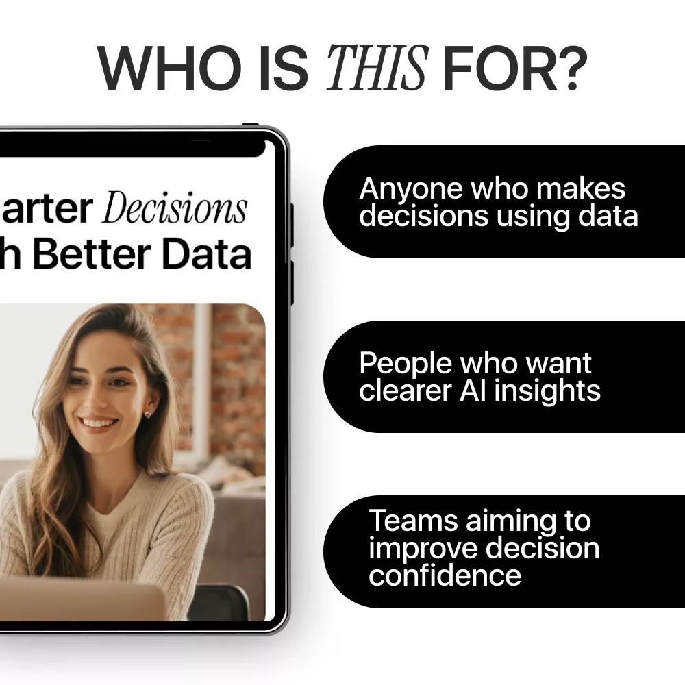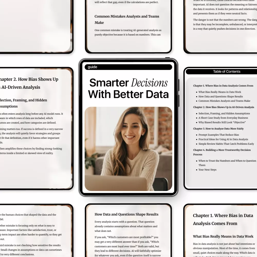 Smarter Decisions With Better Data is a practical digital guide designed to help you understand where bias sneaks into data analysis and how to reduce it—especially when using AI-driven tools. If you’ve ever felt unsure whether your numbers are truly objective, this guide gives you the clarity, structure, and real-world examples you need to make better calls with confidence. Written in plain language, it bridges the gap between data theory and everyday decision-making.