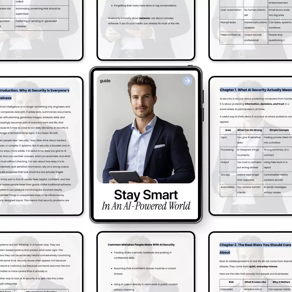 Unlike generic resources that focus on theory, Stay Smart in an AI-Powered World focuses on real behavior, real mistakes, and real-life examples. It connects ai security basics explained directly to how people actually use AI every day—making it practical, relatable, and easy to act on.