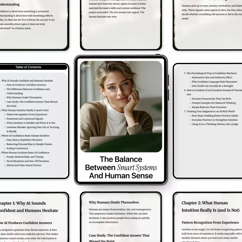 This eBook is perfect for professionals, entrepreneurs, and anyone navigating the modern AI-driven world who wants to sharpen their judgment, understand the limits of technology, and make confident, informed decisions without losing their human touch. If you’ve ever wondered how to balance AI confidence vs human intuition, this guide is your essential roadmap.