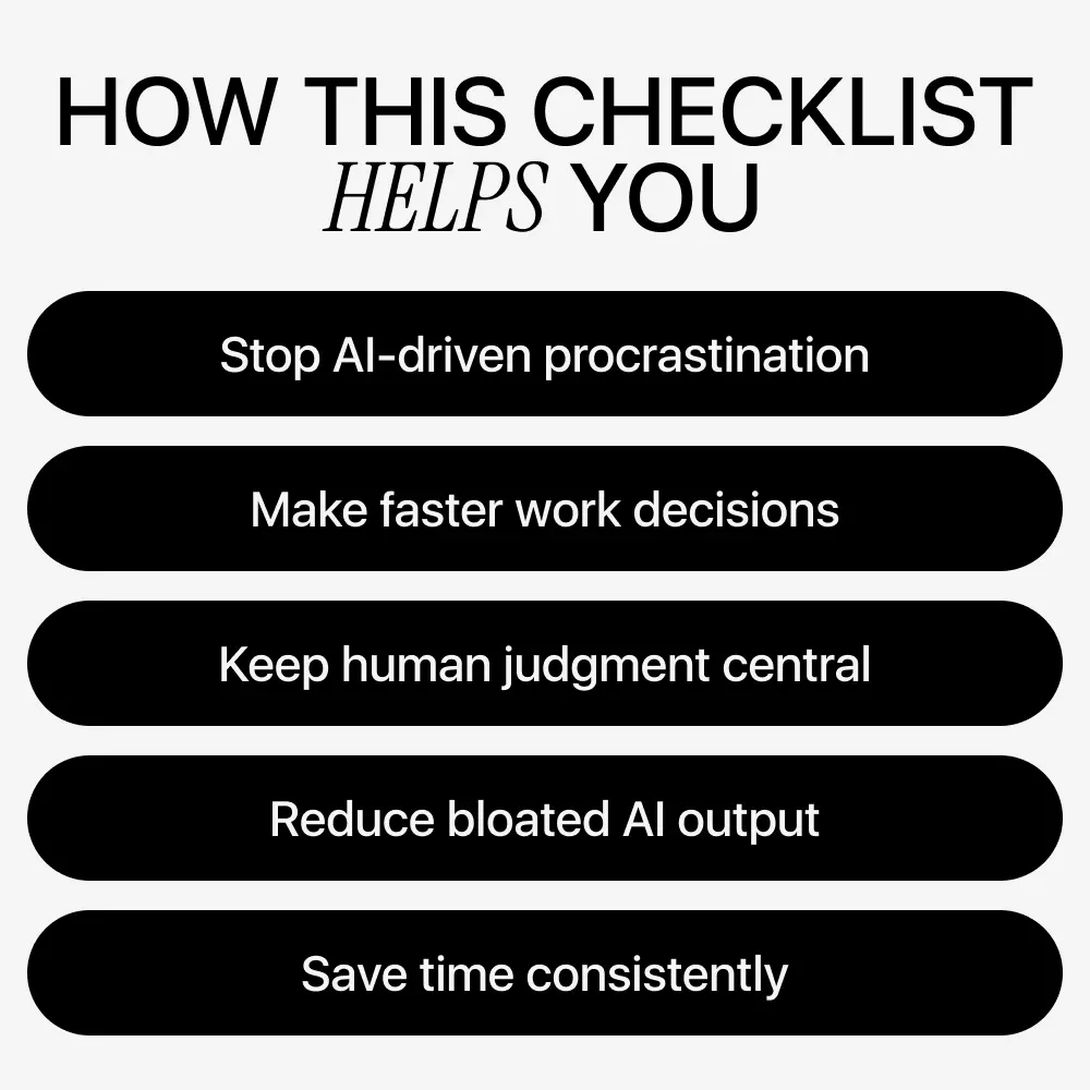 This checklist is ideal for professionals, managers, creatives, knowledge workers, and anyone using AI daily for writing, planning, analysis, or communication. If you’ve ever felt stuck prompting, second-guessing outputs, or cleaning up AI-generated work, this was made for you.