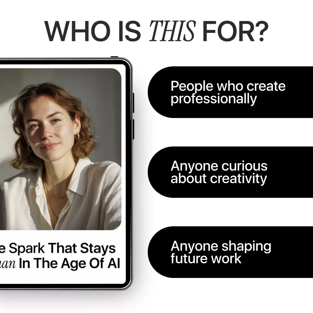This ebook is for creatives, marketers, founders, managers, educators, and curious professionals who want to stay relevant, imaginative, and confident as AI reshapes how work gets done. If you want to use AI without sounding generic, replaceable, or burned out, this guide was written for you.