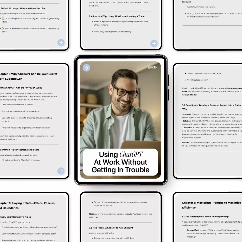 ChatGPT can be a powerful ally at work—but only if you know how to use it safely. Using ChatGPT at Work Without Getting in Trouble is a practical, no-fluff guide designed for professionals who want to boost productivity, save time, and stay compliant with company rules. This guide shows you exactly how to use chatgpt at work without getting in trouble, even in strict or unclear workplace environments. Whether you’re drafting emails, summarizing documents, or brainstorming ideas, you’ll learn how to leverage AI confidently and responsibly.