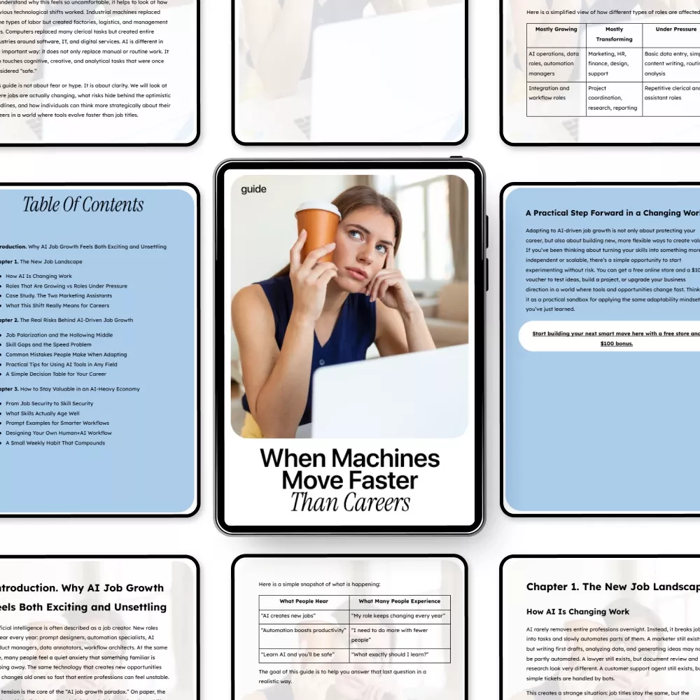 Careers are changing faster than job titles can keep up. When Machines Move Faster Than Careers is a practical, eye-opening guide designed for anyone feeling both excited and unsettled by AI-driven change. Instead of fear-based predictions or vague optimism, this guide breaks down what is actually happening in today’s job market—and how to respond with clarity, confidence, and smart strategy. If you’re worried about ai job growth risks but unsure where to focus your energy, this guide gives you grounded answers and practical next steps.