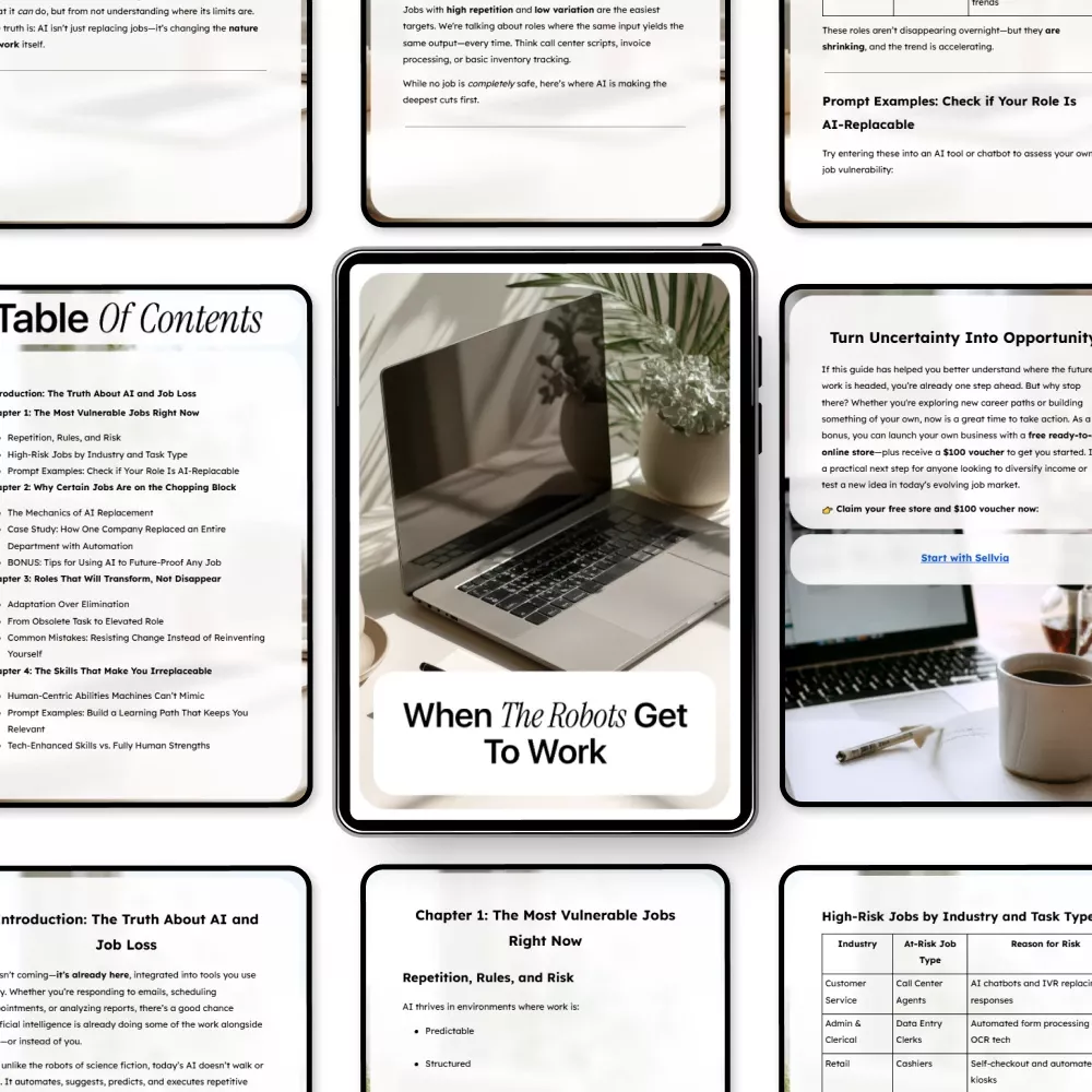 Artificial intelligence is no longer a future concept. It is already reshaping industries, redefining roles, and quietly eliminating certain positions. When the Robots Get to Work is a clear, practical ebook designed to help you understand the truth about automation and make smart career decisions before change is forced upon you. This guide goes beyond fear-based headlines and breaks down what is actually happening, why it’s happening, and how you can respond strategically.