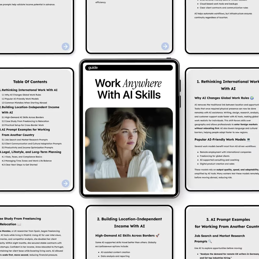 - Building Location-Independent Income With AI: Identify high-demand AI skills across borders, read real-life case studies from freelancing to relocation, and set up your cross-border workflow.