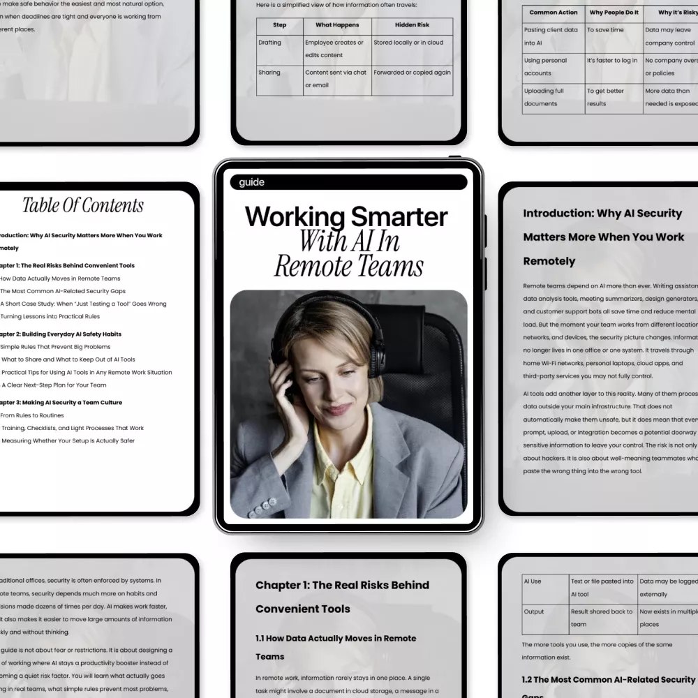 AI tools make remote work faster, easier, and more flexible—but they also introduce quiet risks most teams never see coming. Working Smarter with AI in Remote Teams is a practical, easy-to-follow guide designed to help distributed teams use AI confidently without exposing sensitive data or creating security gaps. This guide focuses on real situations, not theory, showing you how to balance productivity with responsible AI use in everyday remote work.